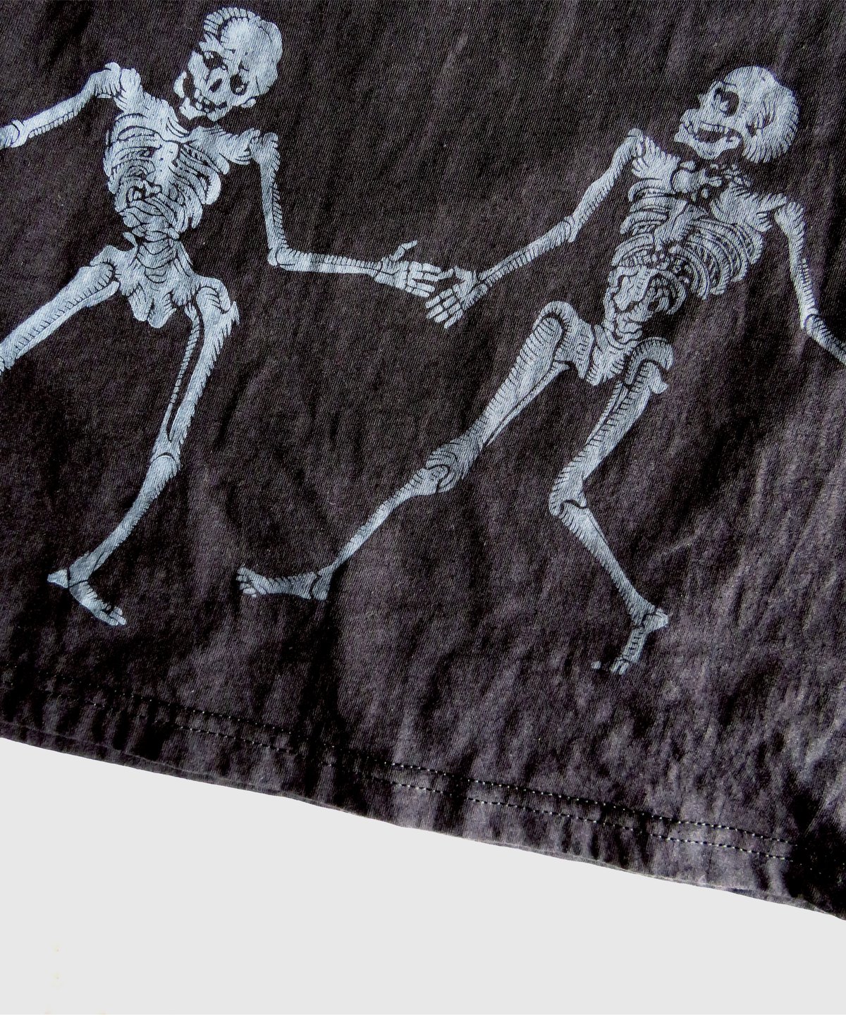 macabre dance is a Middle Ages theme, normally representing a dance of humans and skeletons, the living and the dead: in this case too, skeletons make a dance around the t-shirts, dancing with you!